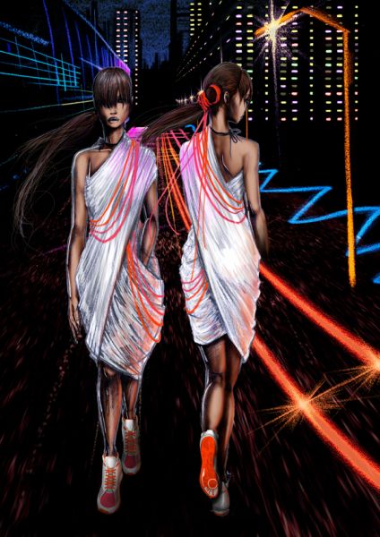 "Blaue Stunde" ist eine Damenkollektion, die als Casual-Bekleidung aber auch als Abendmode zu verstehen ist. Die experimentellen Schnitte sind durch Drapieren entwickelt worden und hatten Ihren Ursprung in geometrischen Formen, wie Kreis, Dreieck oder Rechteck.